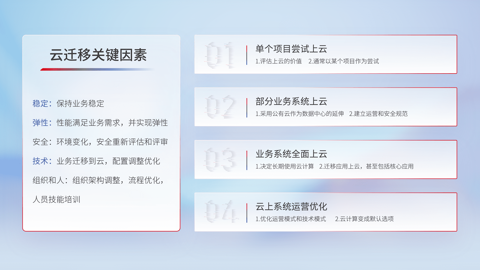 结合实际业务,,,从规划设计、、、、云平台选型、、、云原生改造、、数据迁移、、、集成交付,,迁移全过程为客户识别最佳上云路径,,做好风险识别管理,,设计网络架构、、身份权限、、安全审计合规、、、操作审计、、日志审计、、、、监控告警策略、、、多站点容灾设计等,,,对云上基础设施进行整体规划,,提升IT治理水平,,,以满足弹性、、、高可用、、、、高性能的需求。。。