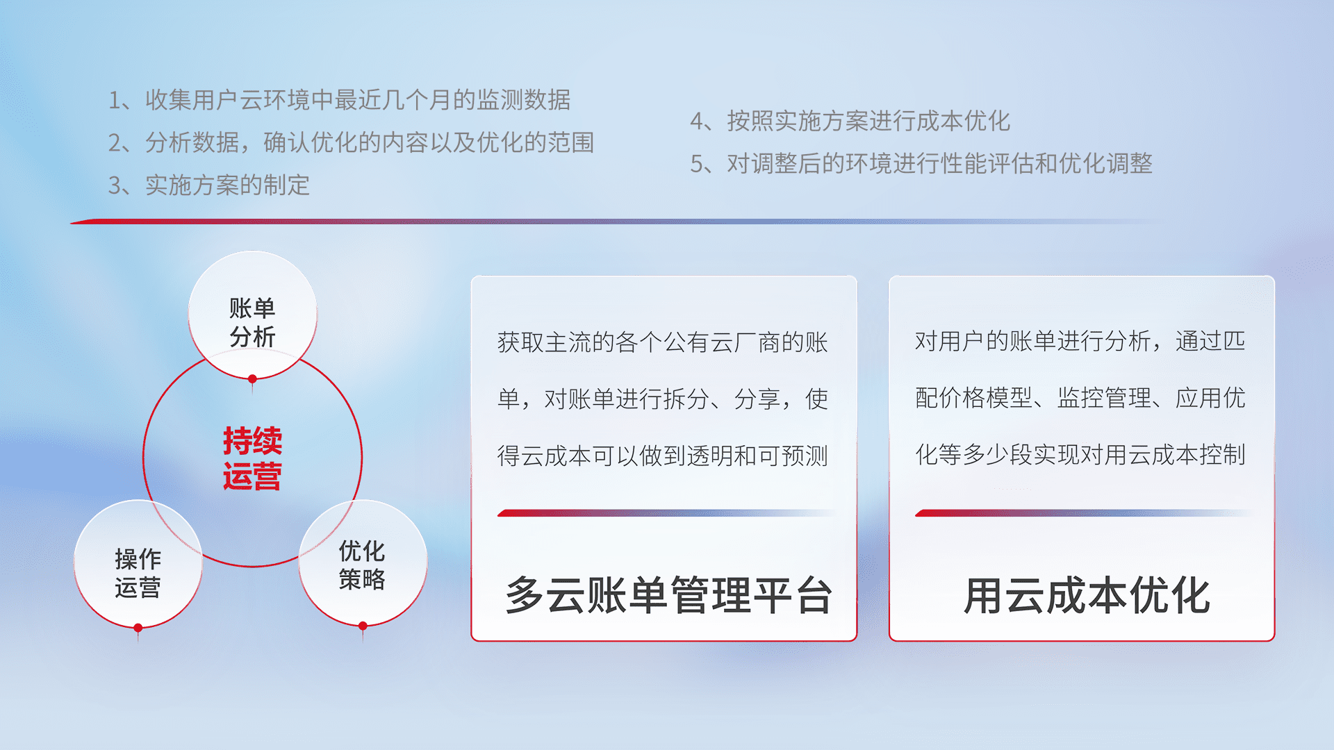 通过多云纳管,,,,以统一的资源数据模型把客户的云资源进行抽象和封装,,,,进而实现对多云资源的统一操作,,,,保障云资源管理的可靠性、、、、稳定性与可用性。。。量身定制化运维内容,,配置、、、开发运维、、、补丁管理、、、、备份、、监控、、认证和访问管理、、、、审计和日常巡检等,,保障在用云过程中的可靠度,,稳定度以及高可用率。。。