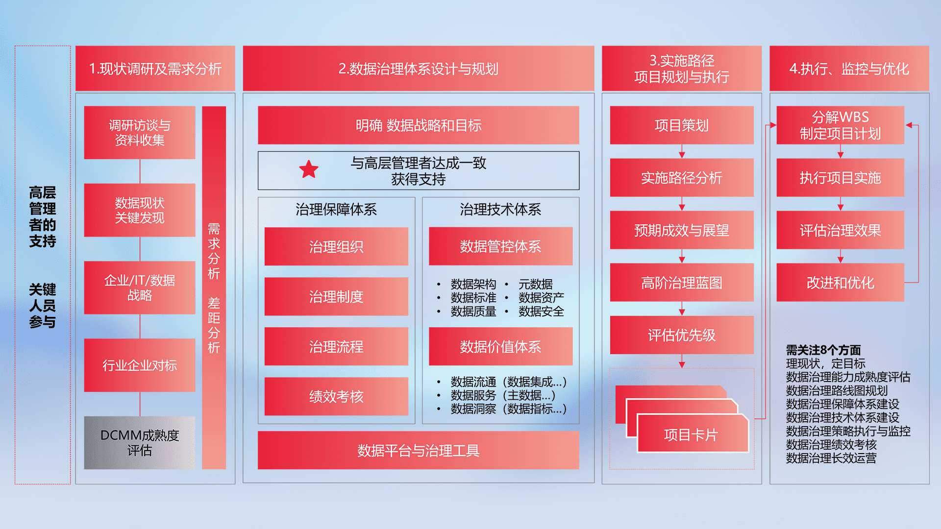 制定并执行统一的数据标准,,规范数据定义和格式,,,,消除冗余和不一致性,,,,实现跨部门和跨系统的数据一致性,,,,为企业提供标准化的数据基础。。